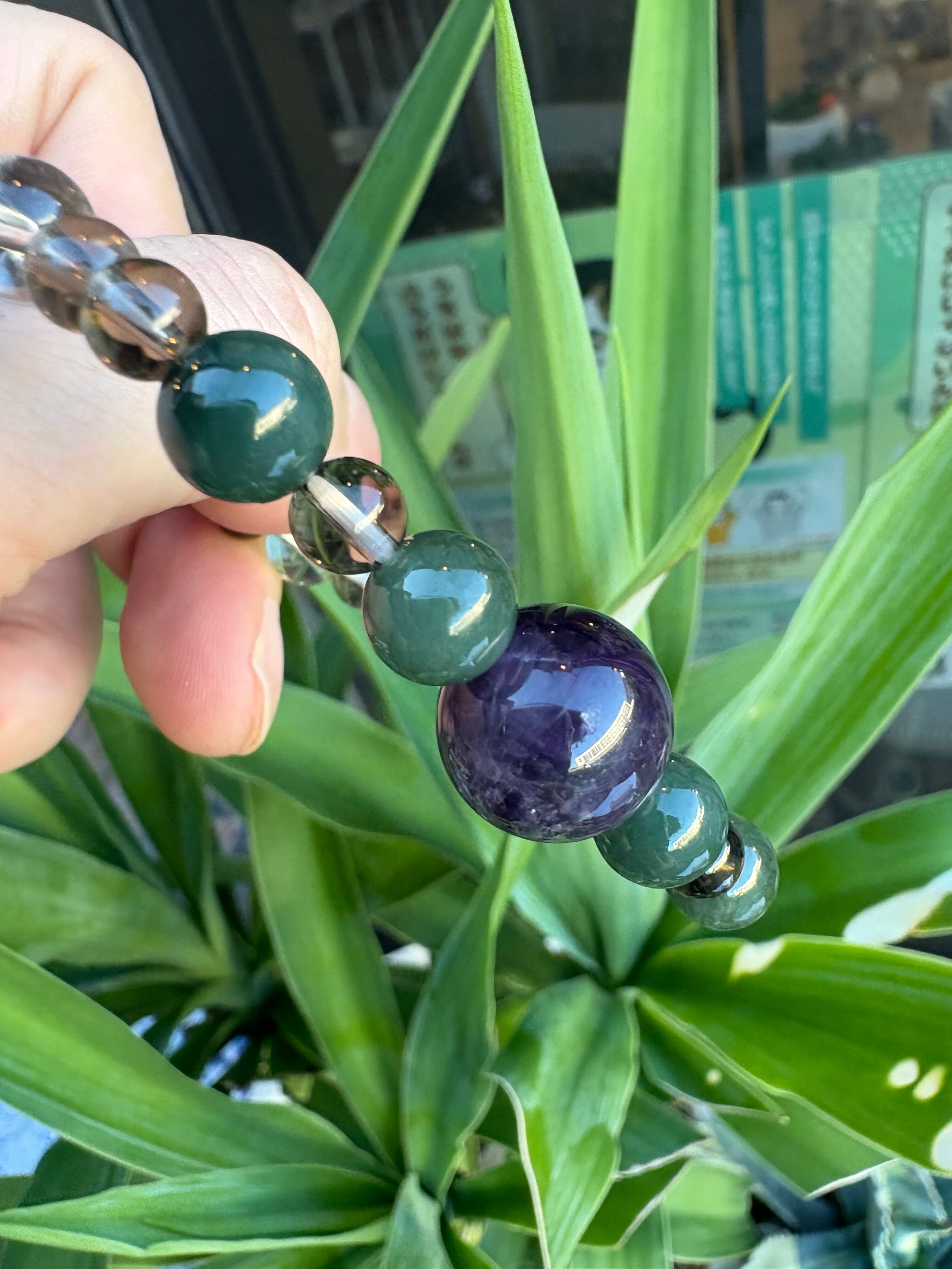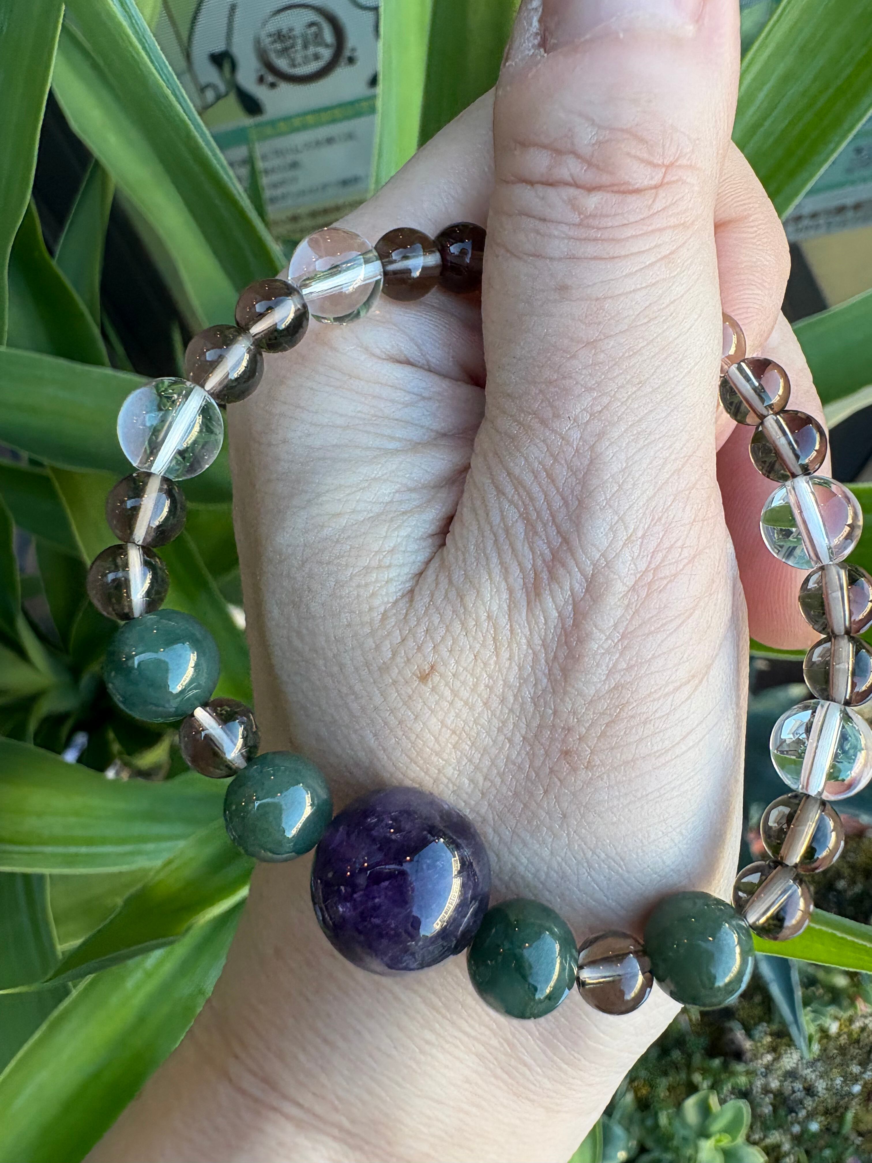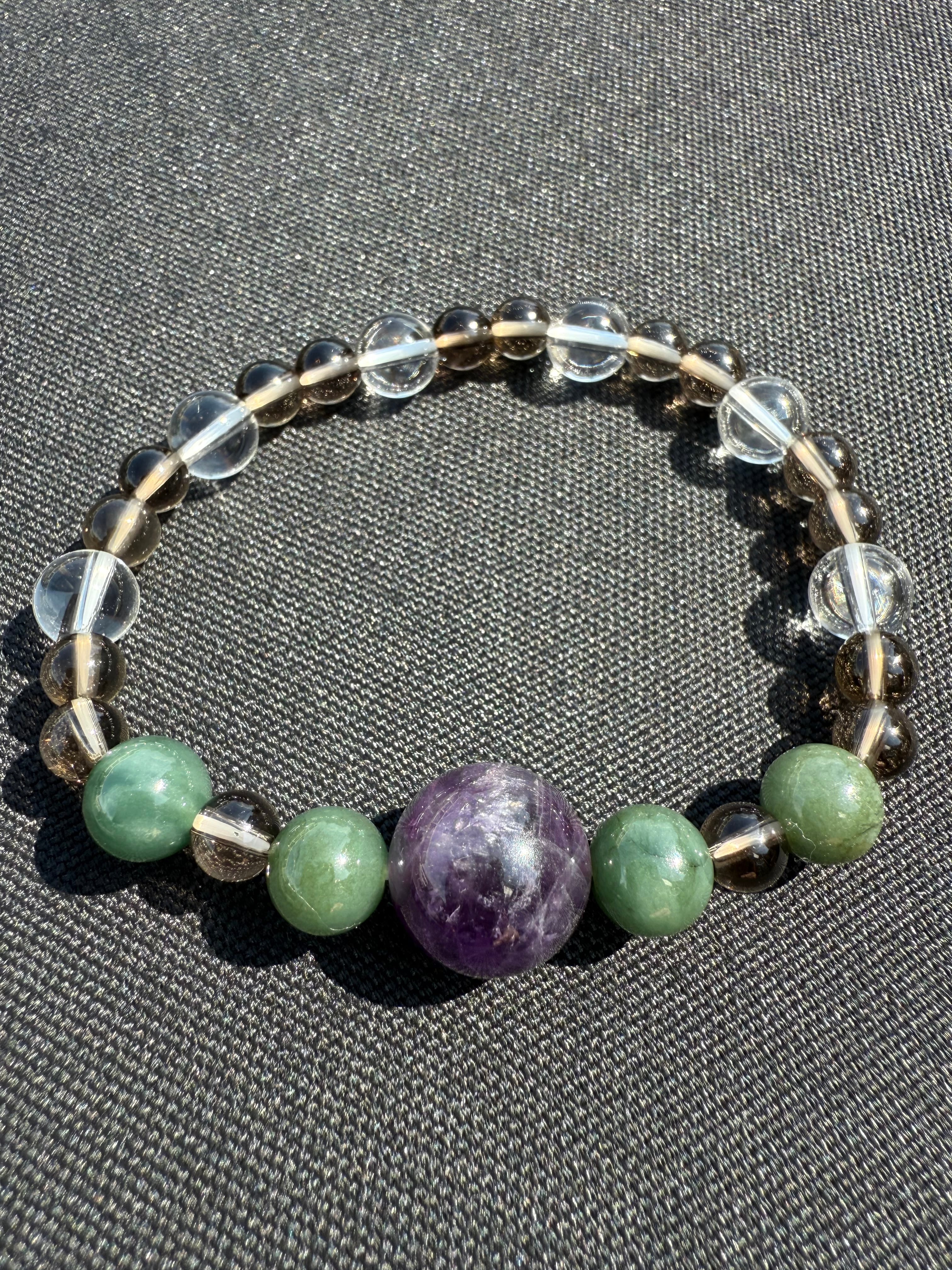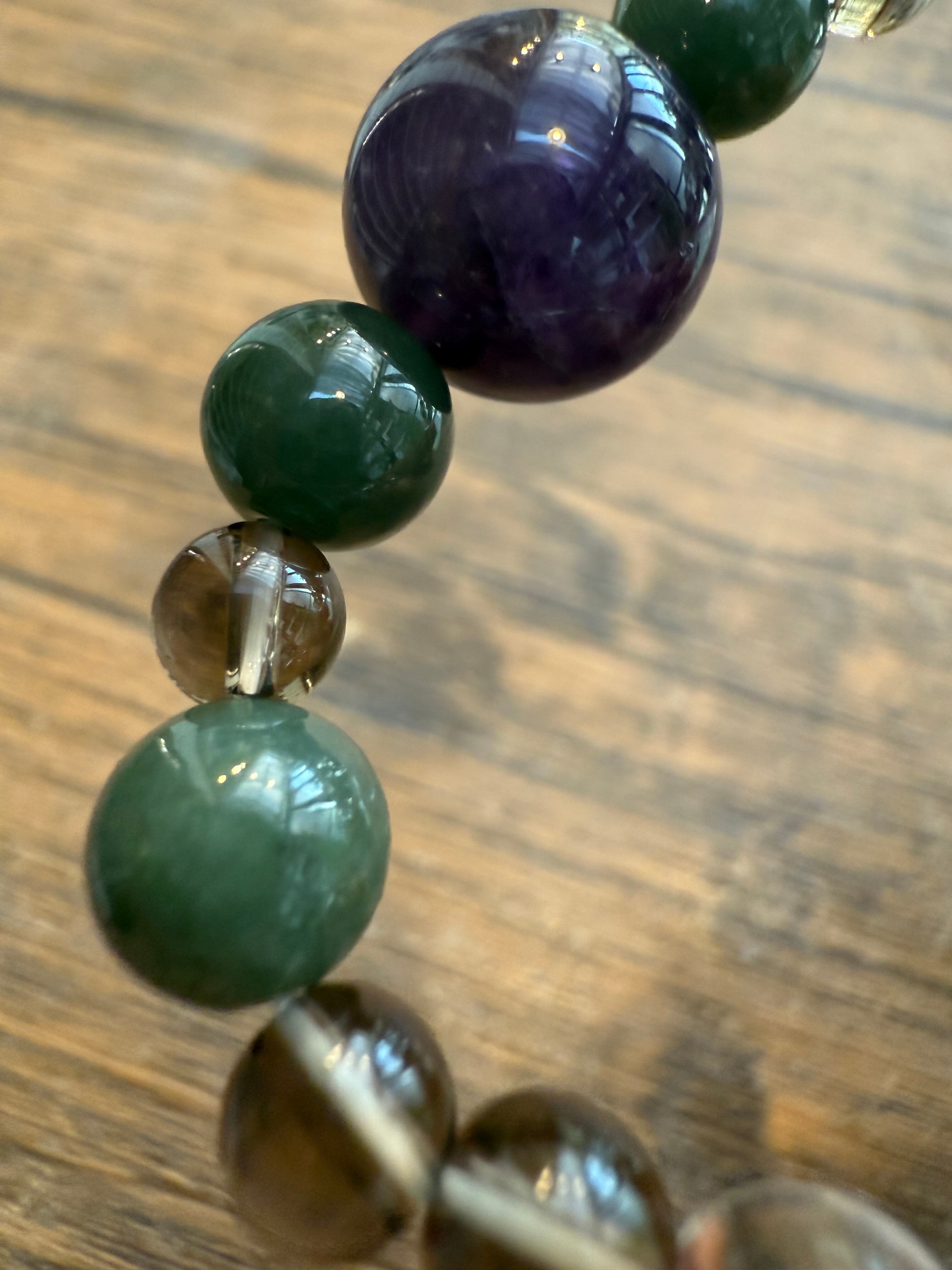 アメジスト、スモーキークォーツ、ヒスイが融合したこの商品は、心を穏やかにし、不安を和らげます。それぞれの石が持つエネルギーが調和し、特別な力を発揮します。