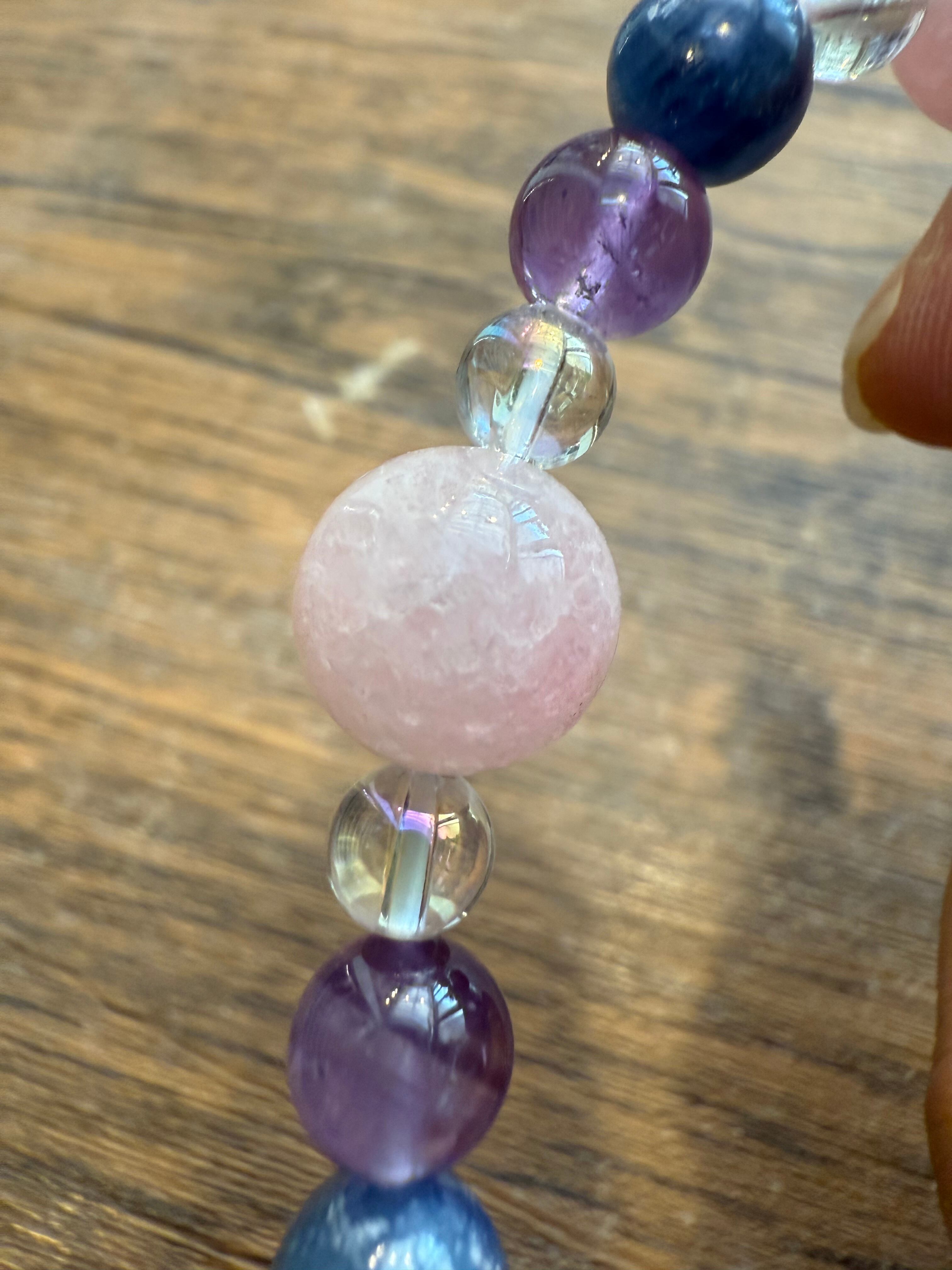 クンツァイト、ラベンダーアメジスト、カイヤナイト、オーラ水晶が調和したこのブレスレットは、深い癒しと心の安定をもたらします。それぞれの石が持つ力が相まって、あなたの心をやわらかく包み込みます。