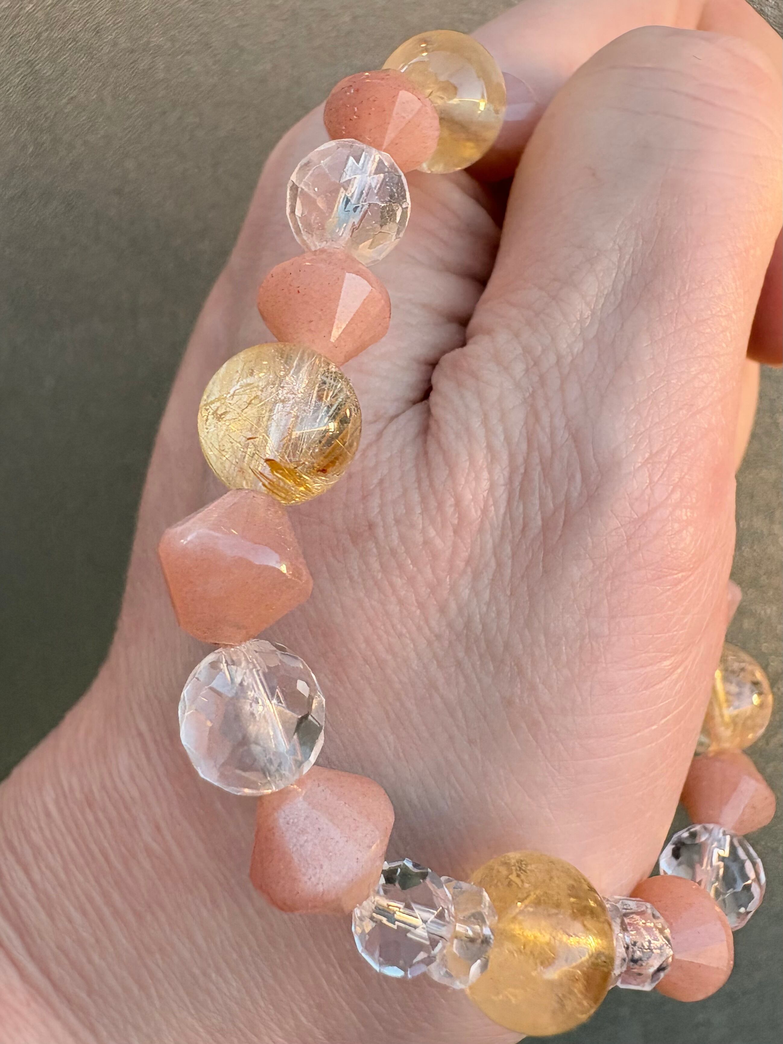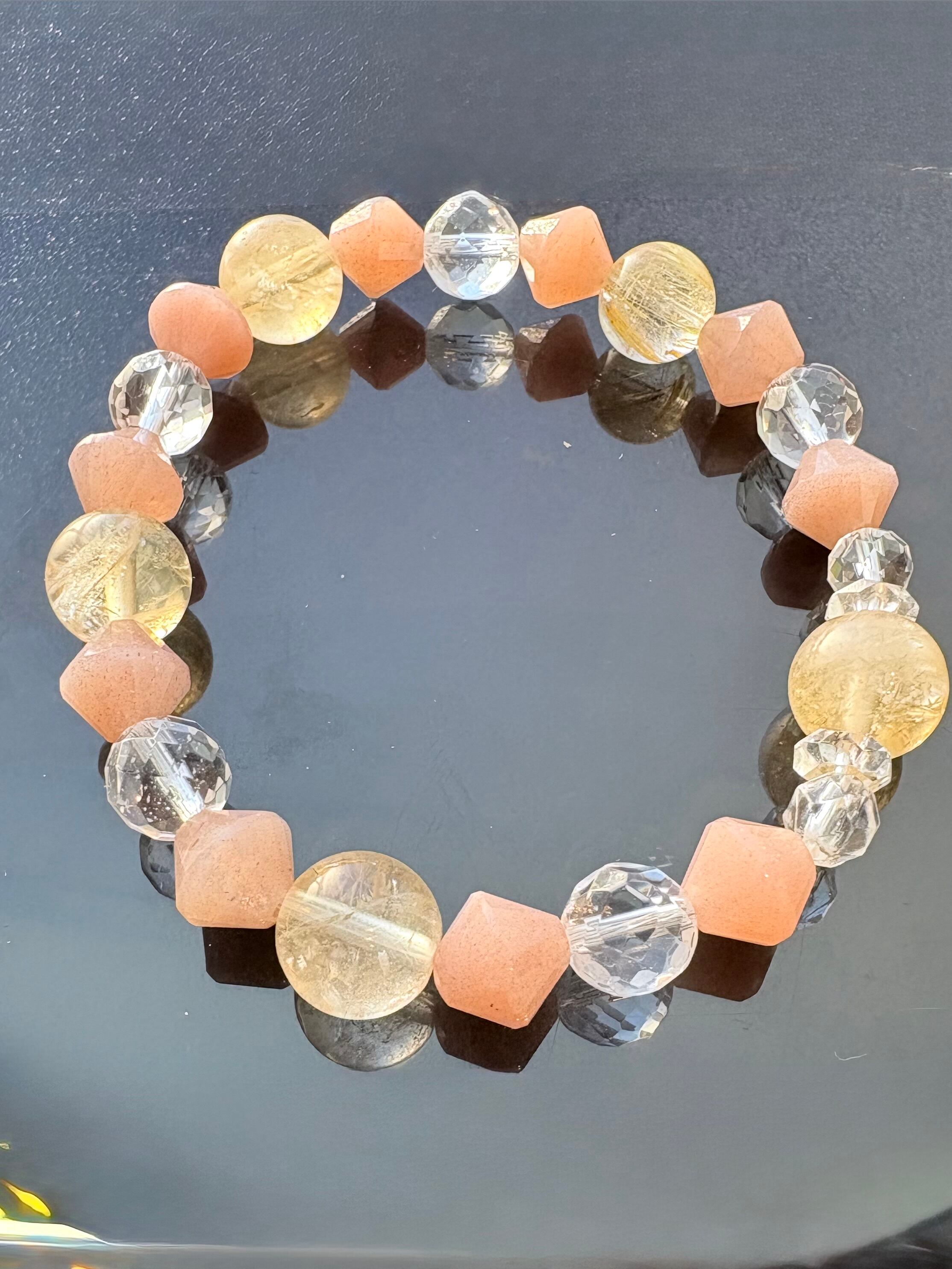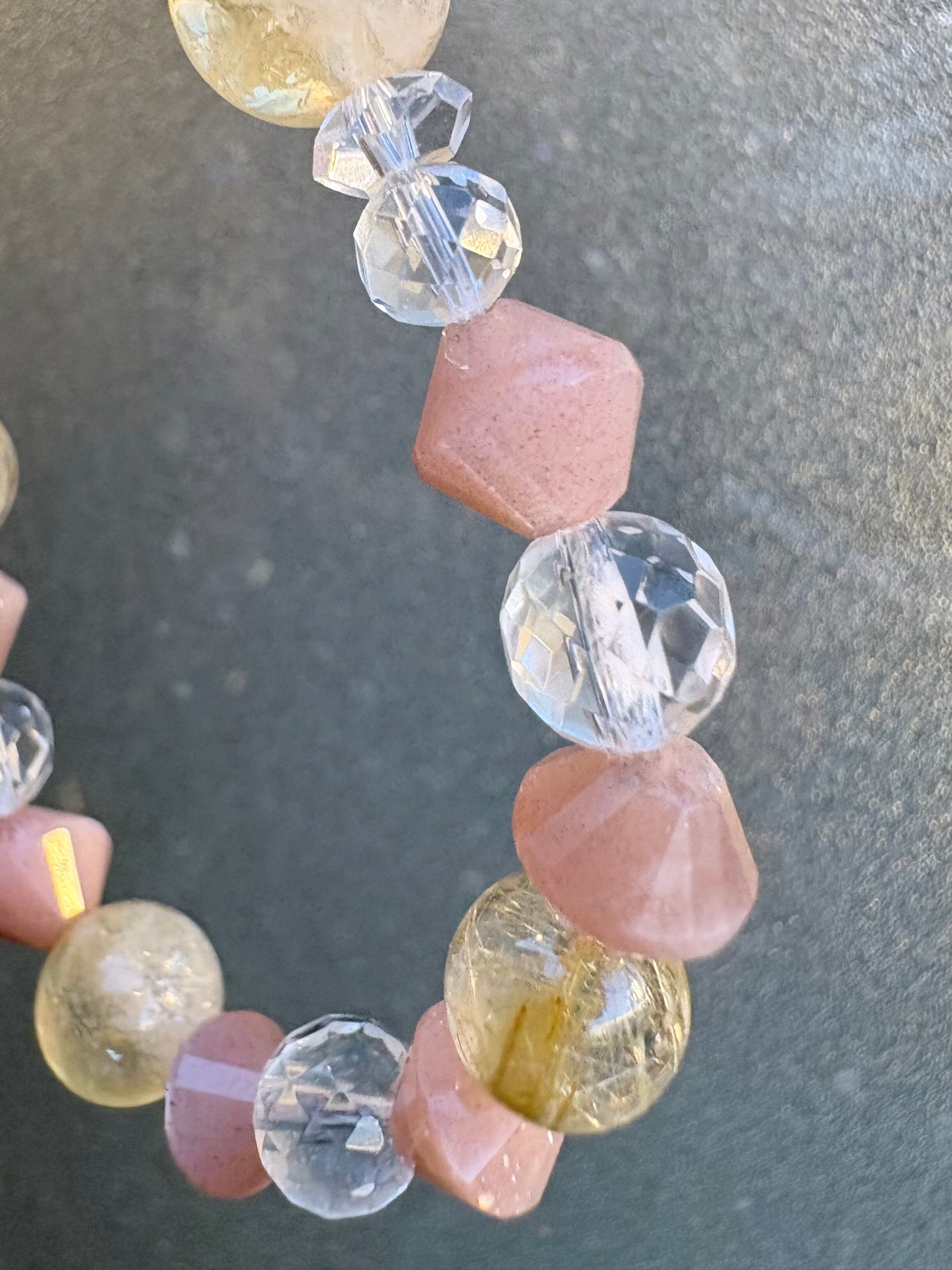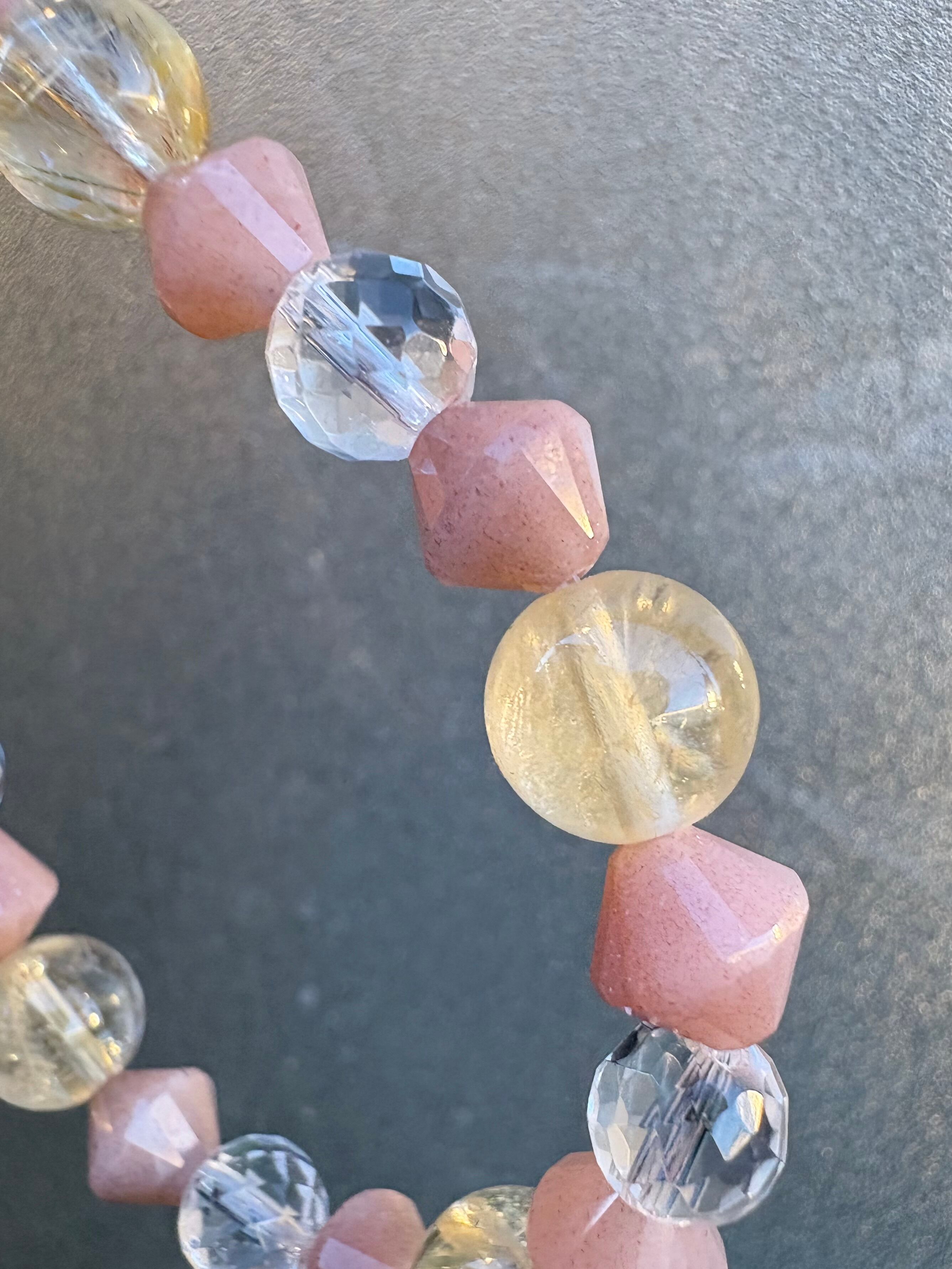 ピンクムーンストーンがトゲトゲした気持ちを優しく癒やし、シトリンが未来を照らす活力を与え、水晶がその純度を高めます。