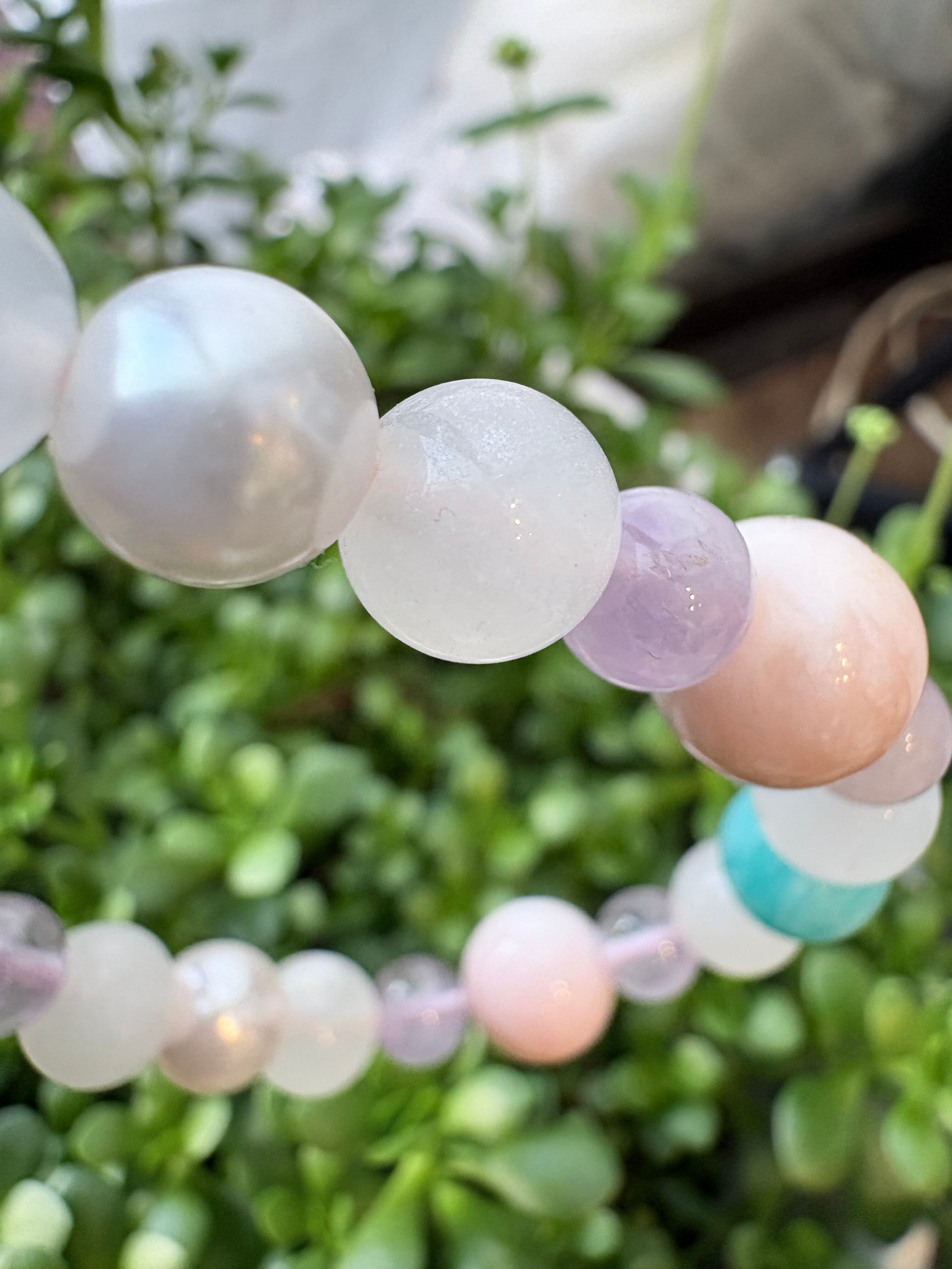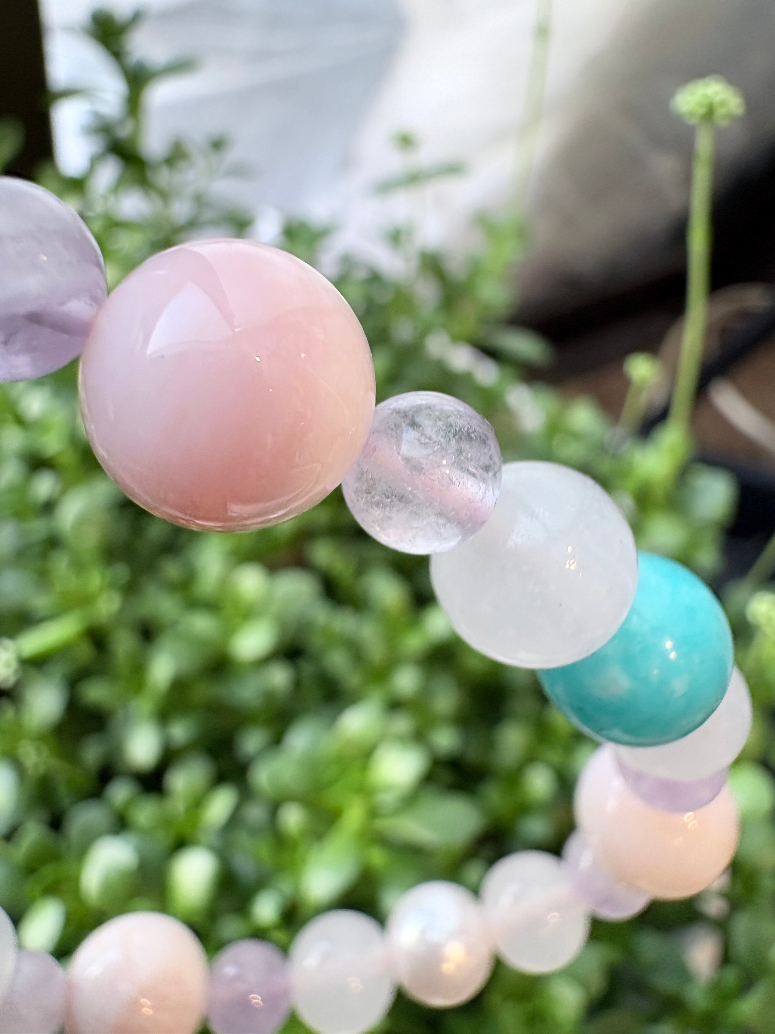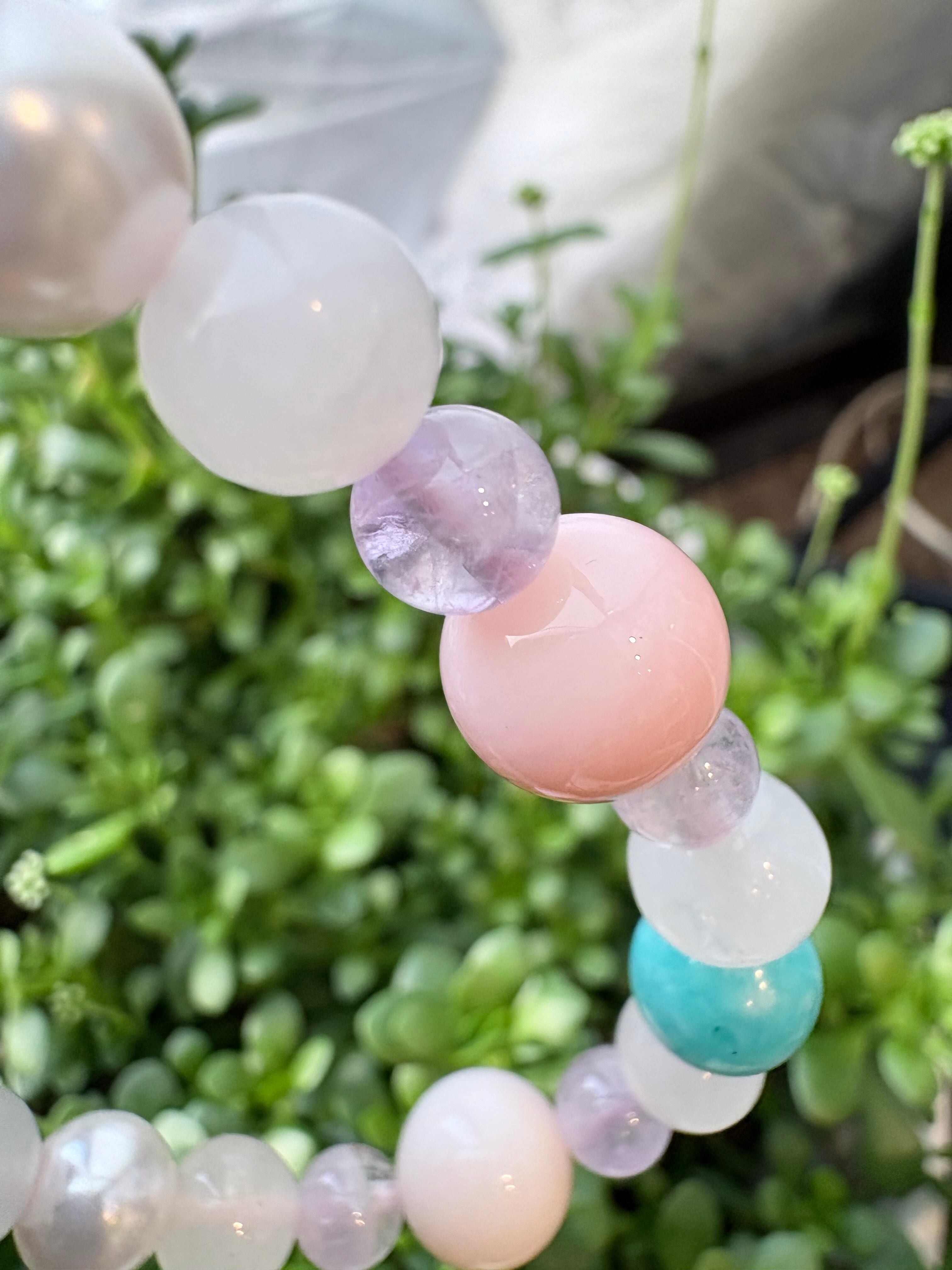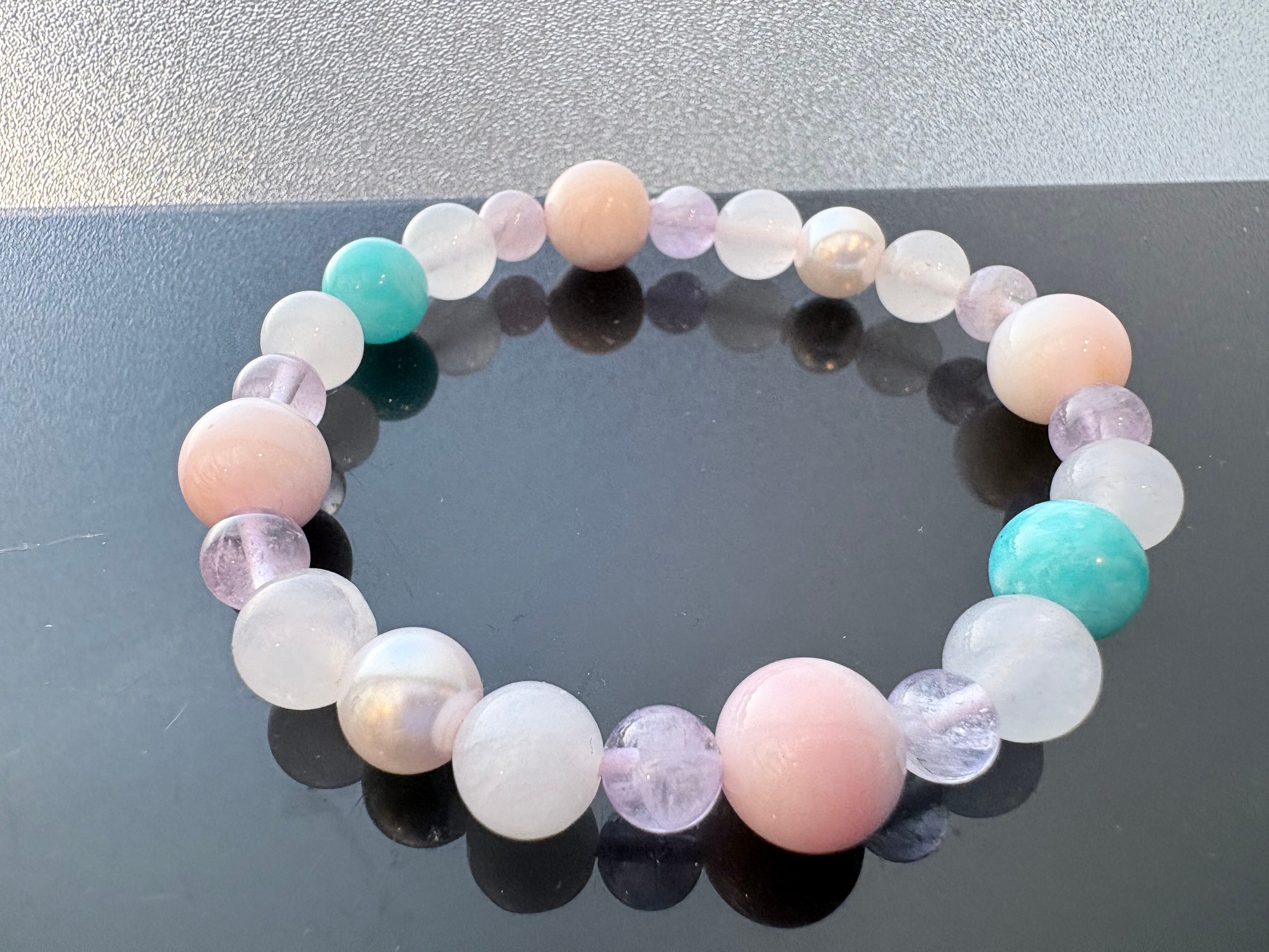 ピンクオパール10mm、ムーンストーン8mm、ラベンダーアメジスト6mm、アマゾナイト8.5mm、淡水パール8mm