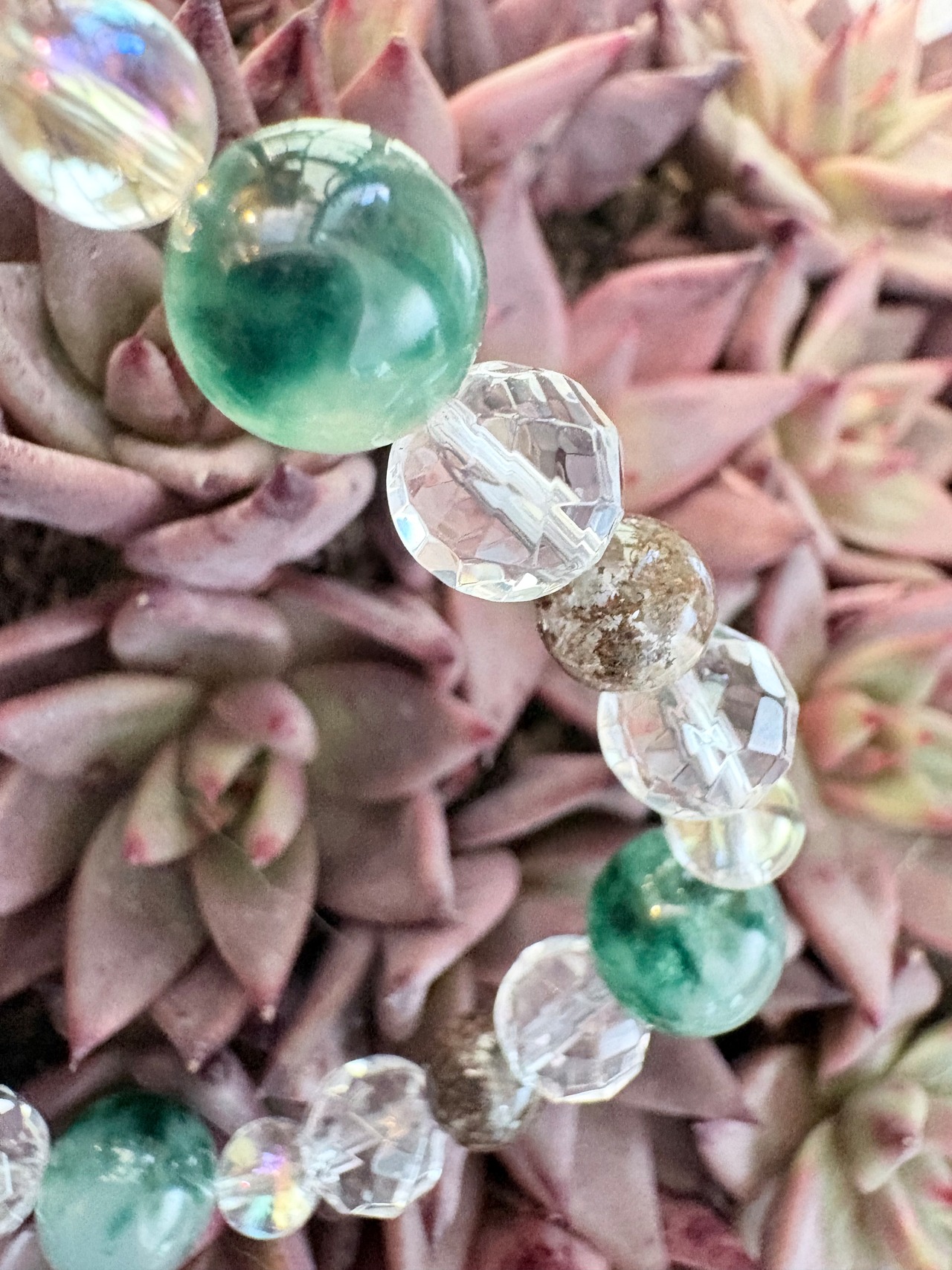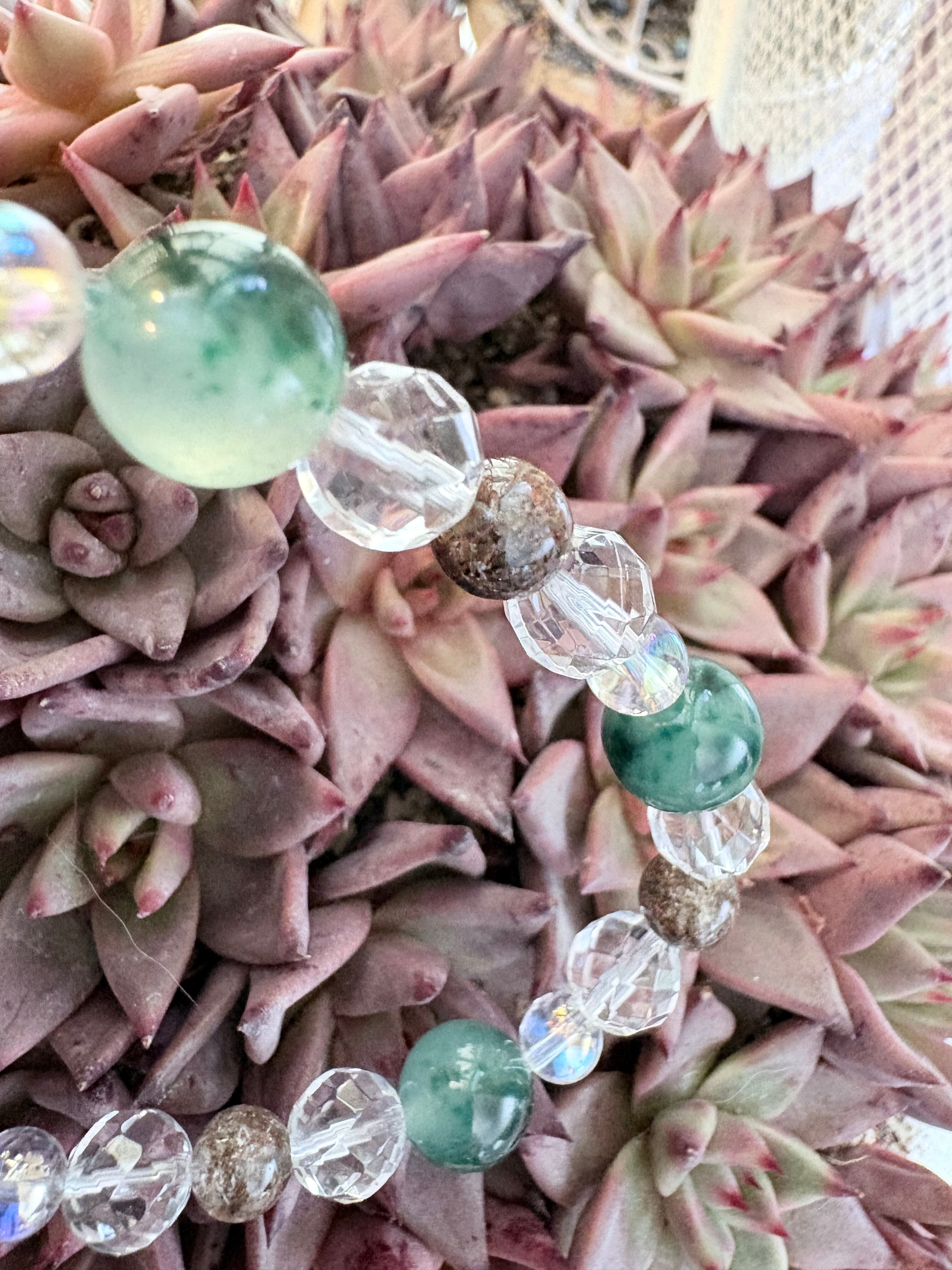 グリーンプレナイト10mm、カット水晶8mm、ガーデンクォーツ7mm、オーラ水晶6mm