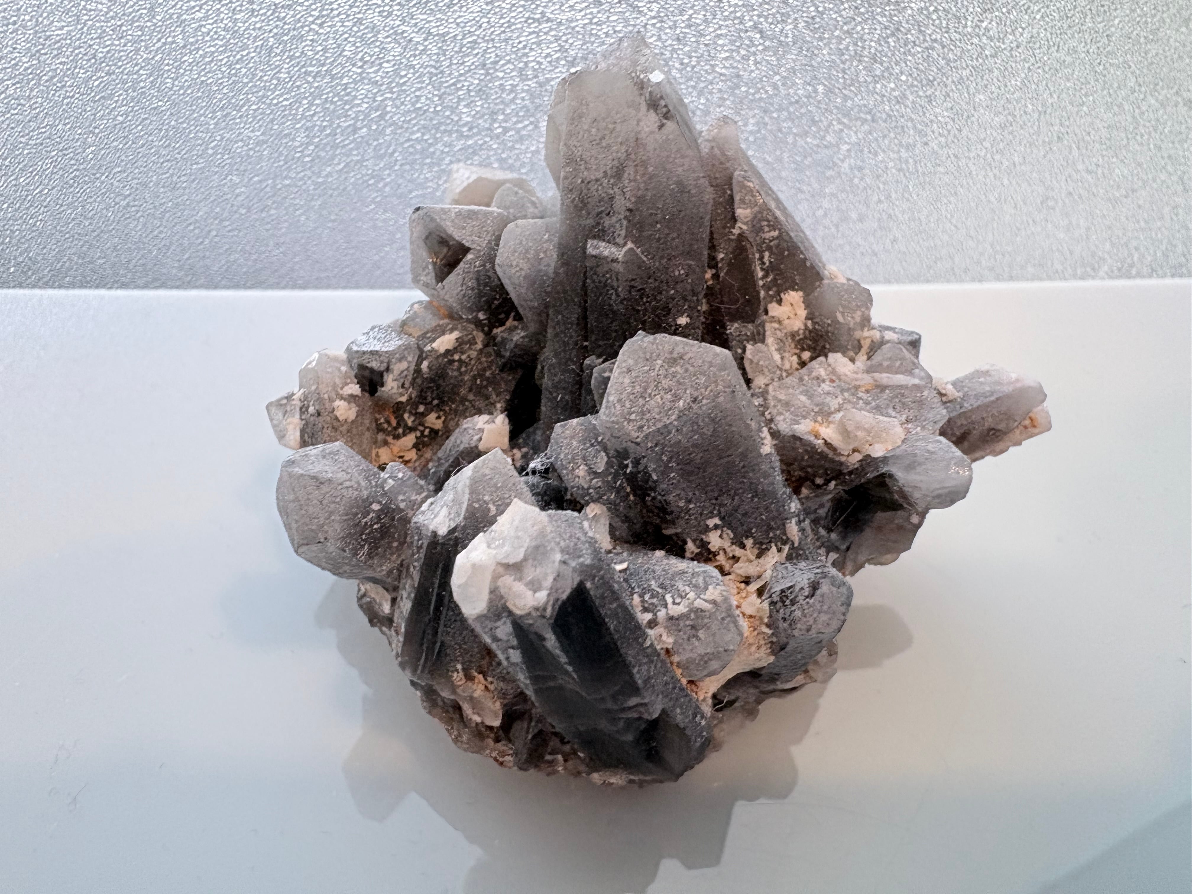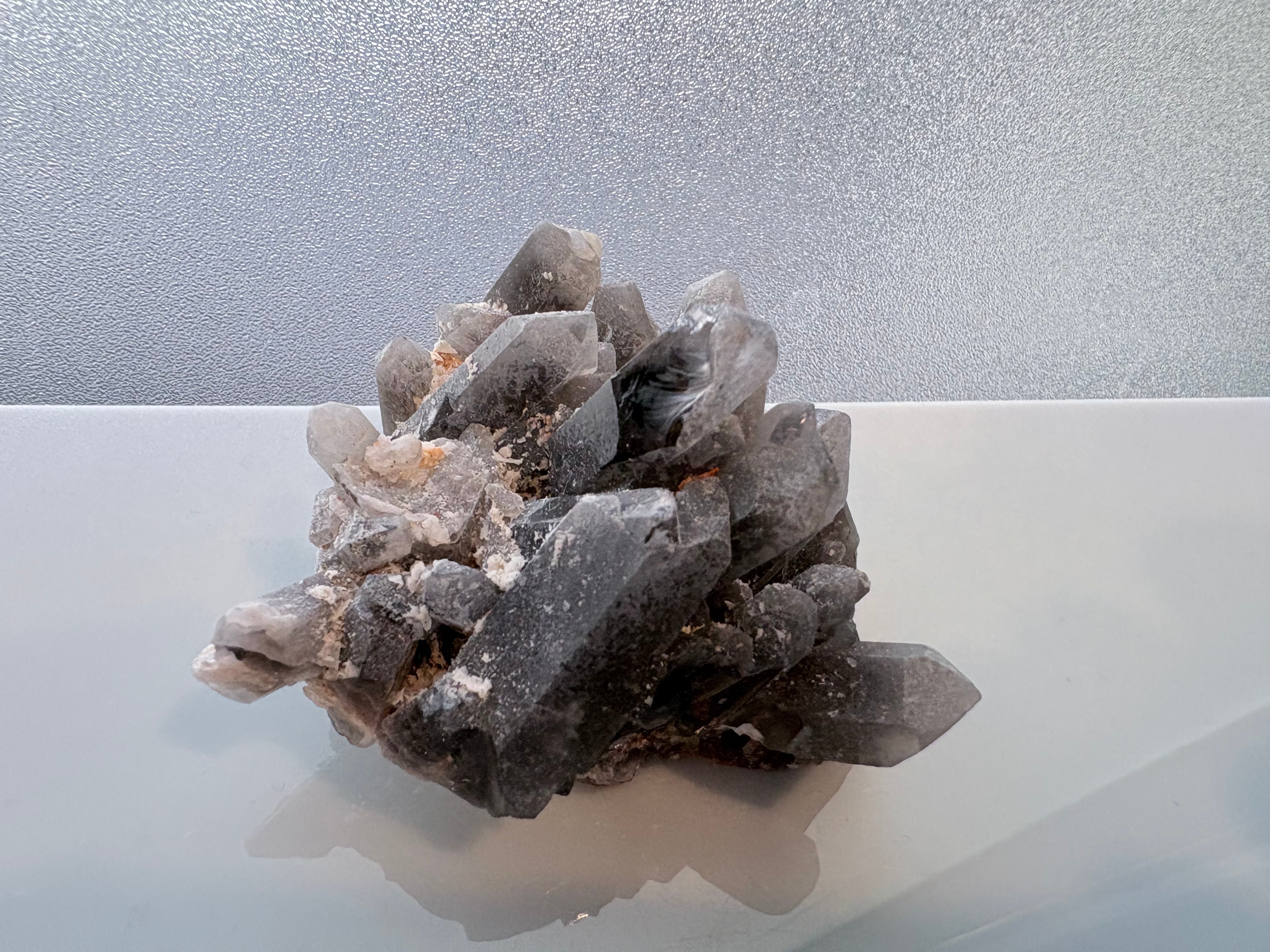 天然のモリオンは非常に希少ですが、この「焼き」の工程を経たクラスターは、水晶の結晶構造を保ったまま、より深い黒へと深化しています。