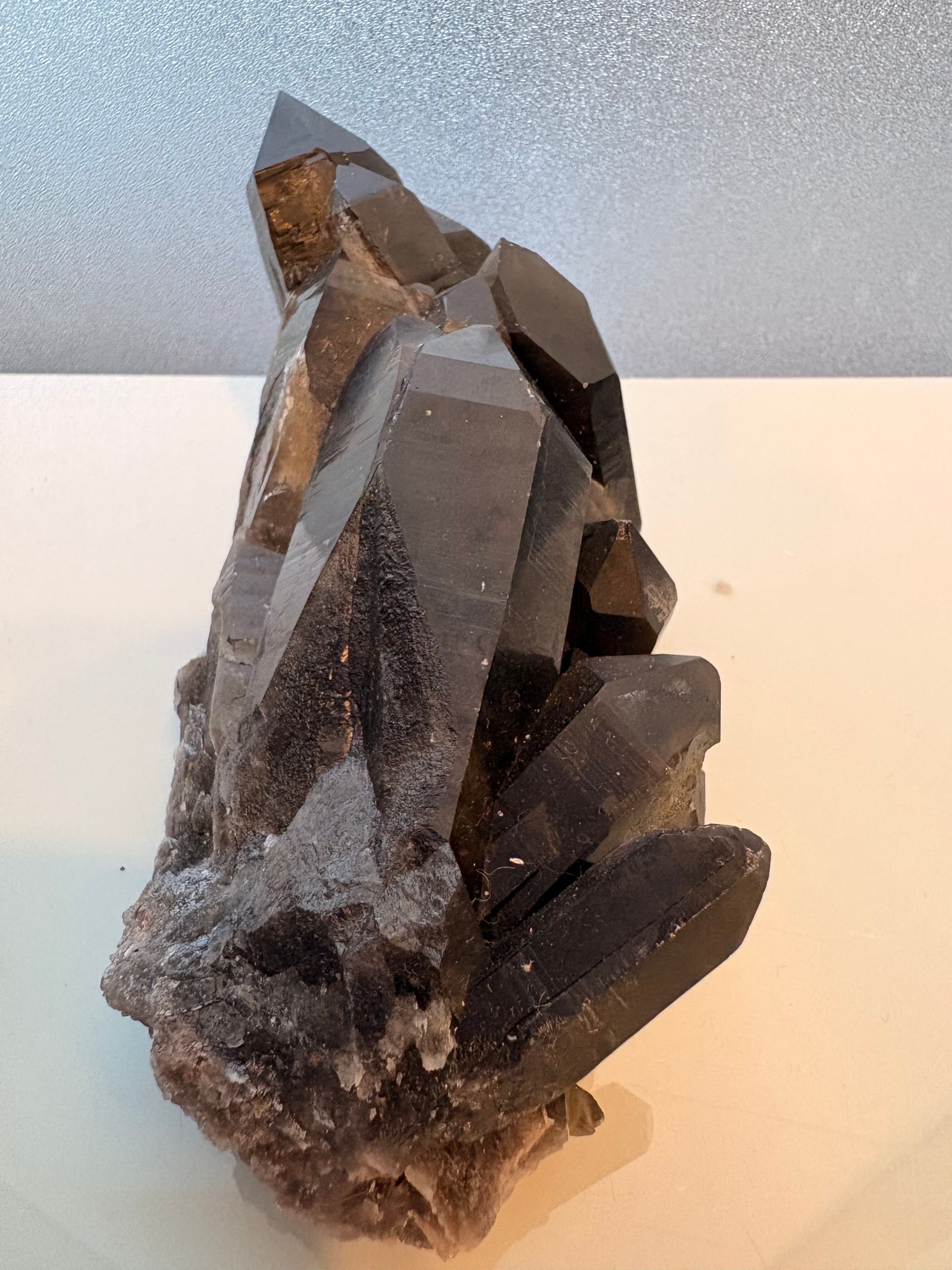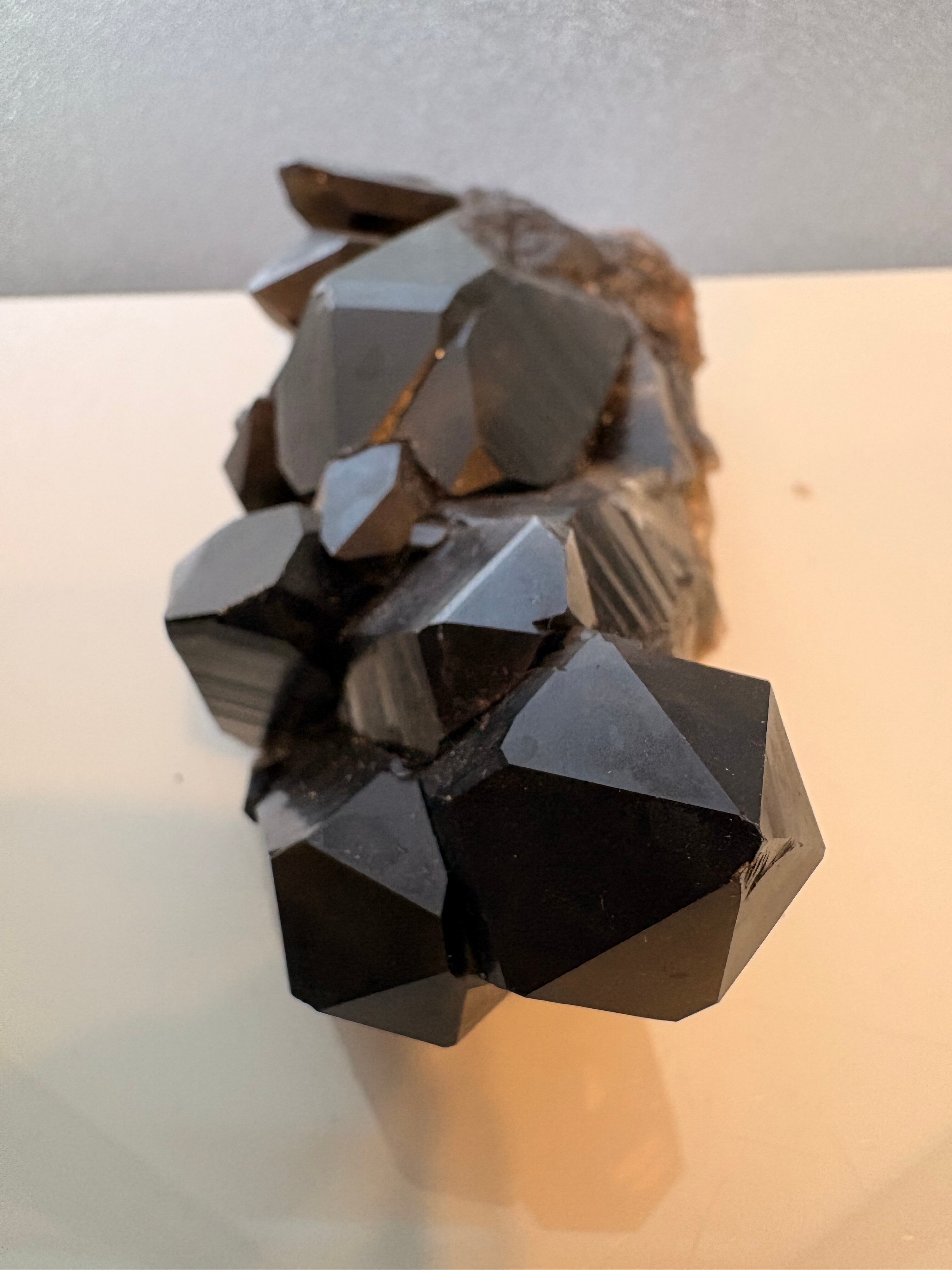 エッジの効いた鋭いポイントと、均整の取れたクラスター形状が特徴。光を反射してキラリと輝く漆黒の結晶は、インテリアとしても圧倒的な存在感を放ちます。