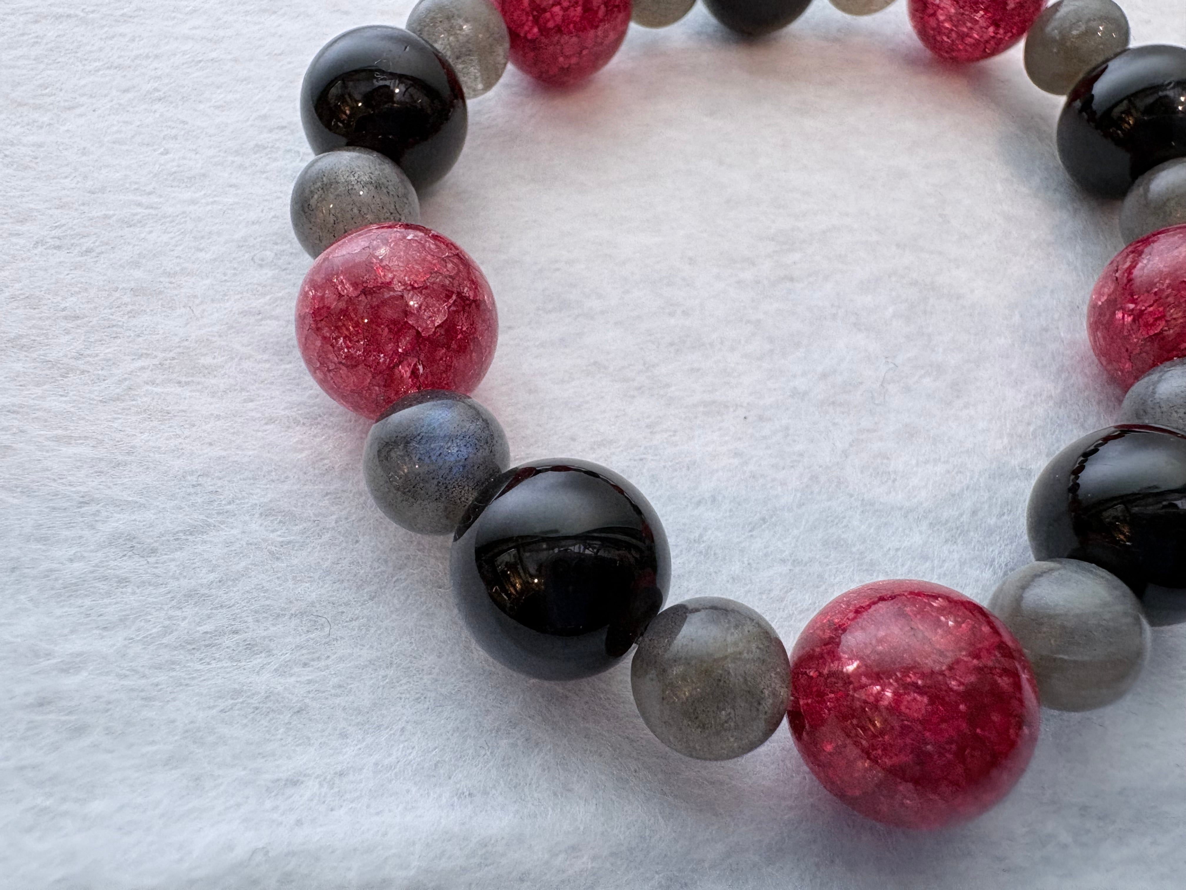 鉄壁の盾と変革の光を。モリオン、ラブラドライト、クラック水晶染め赤