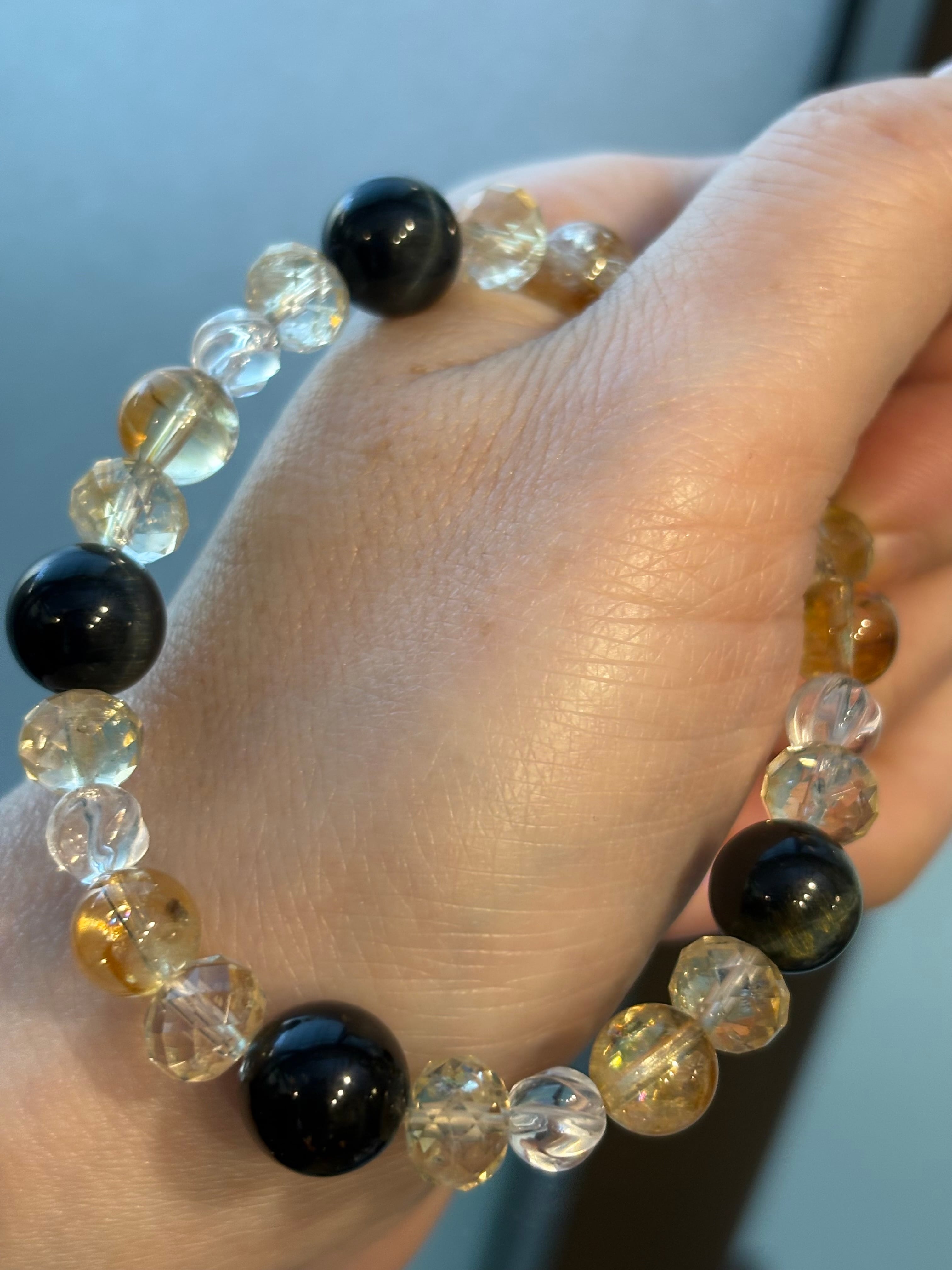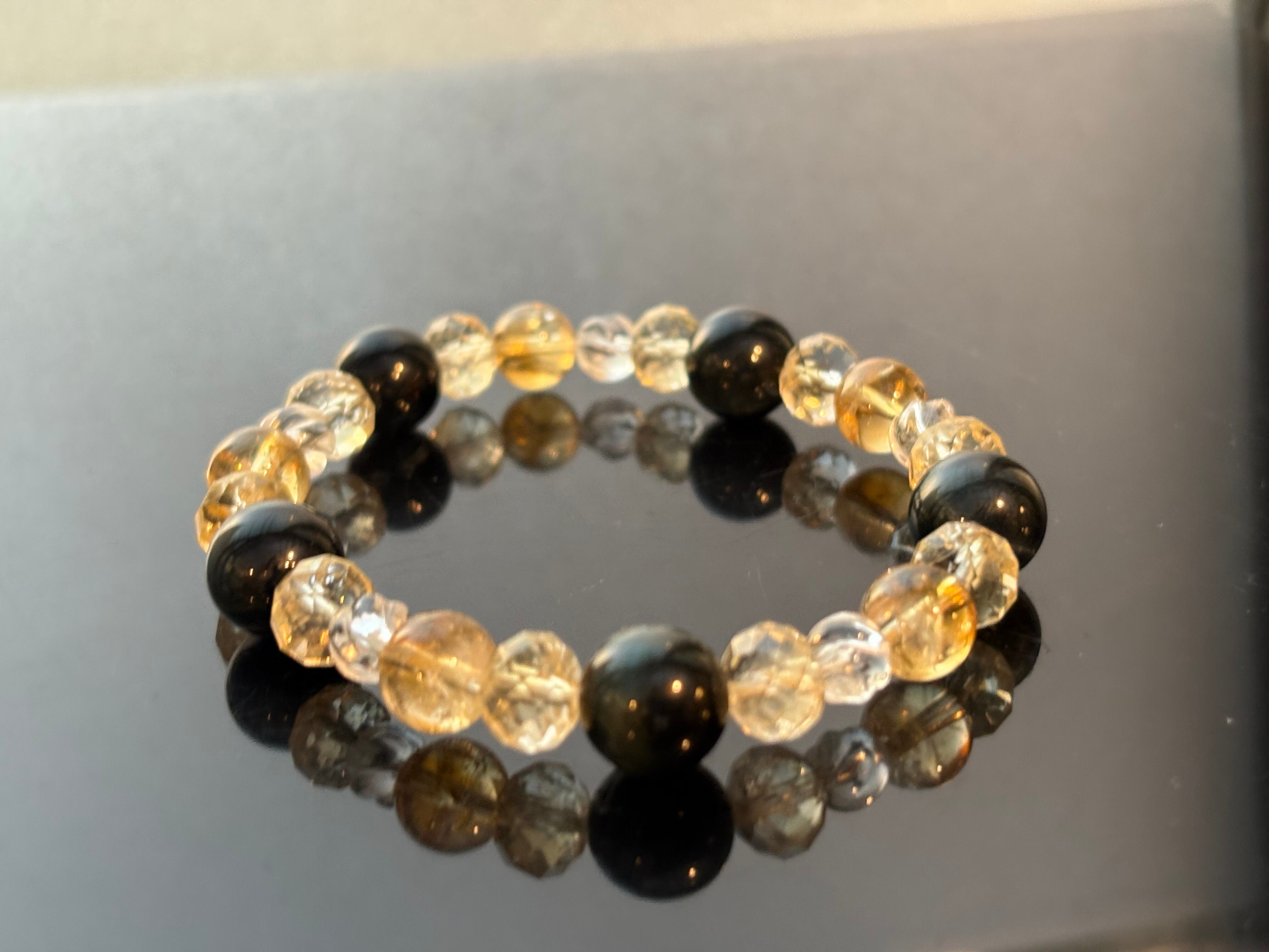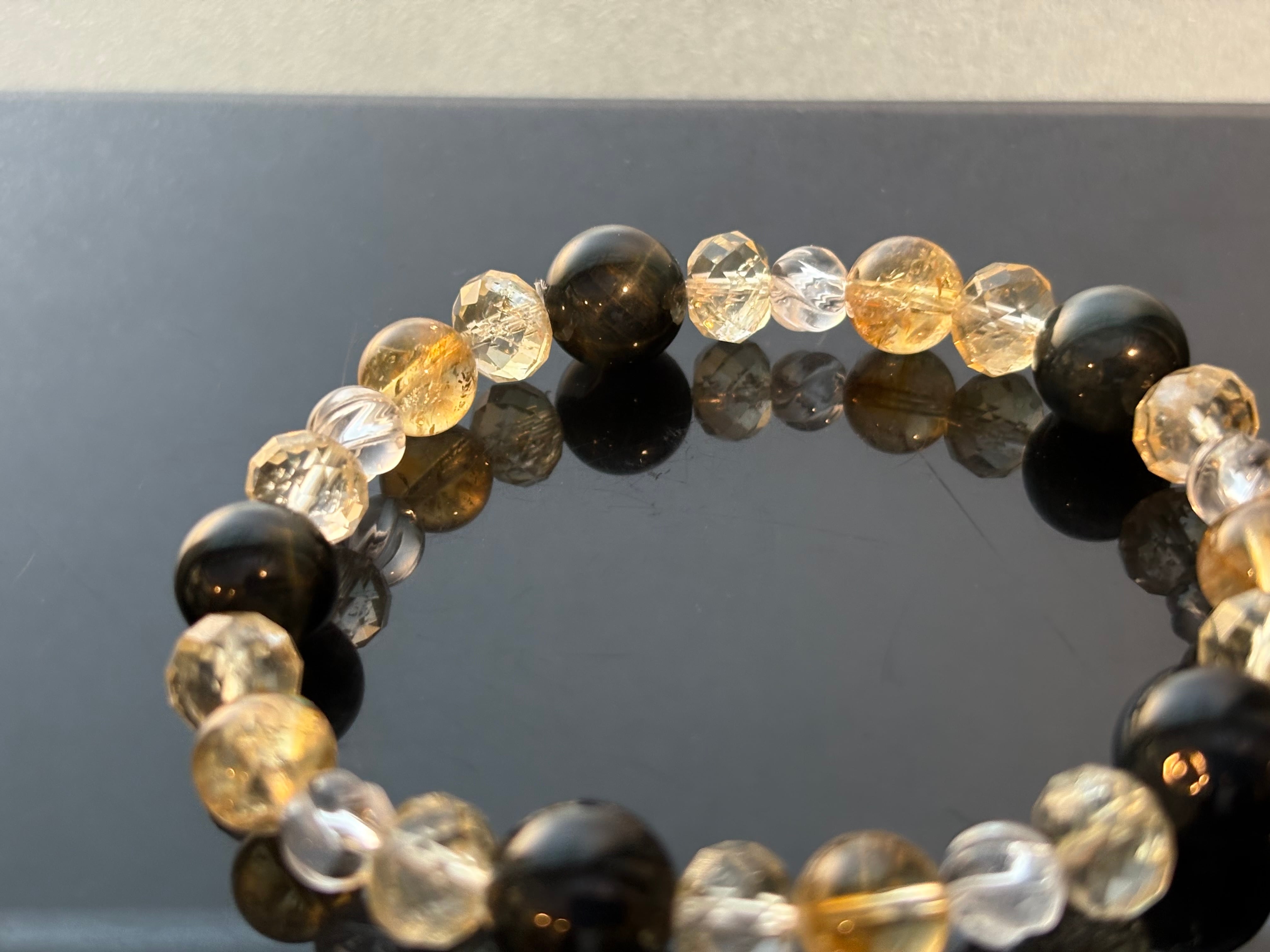 金運の石であるシトリンをメインに、鋭い判断力のタイガーアイ、そしてエネルギーを循環させるツイスト水晶。
