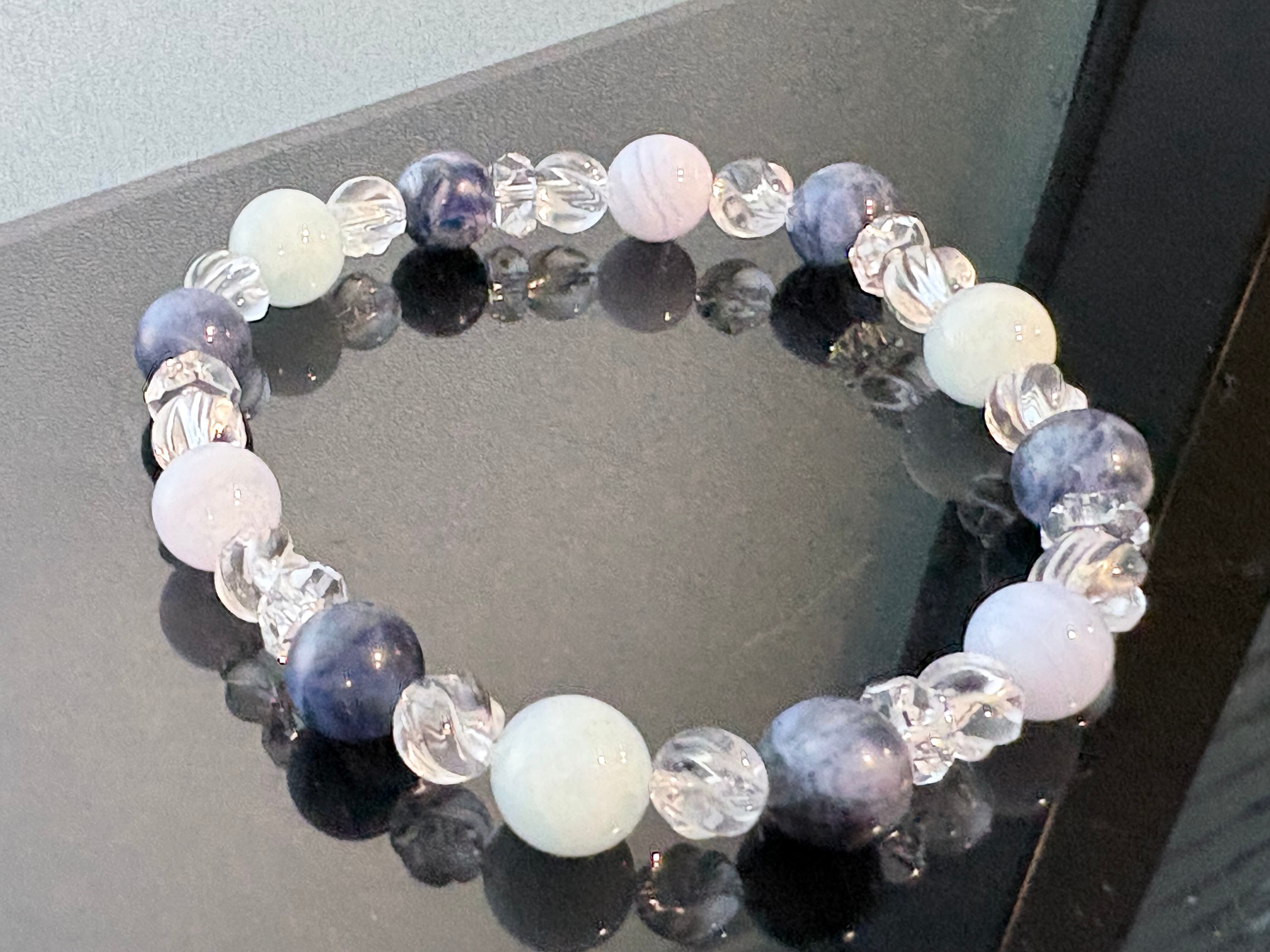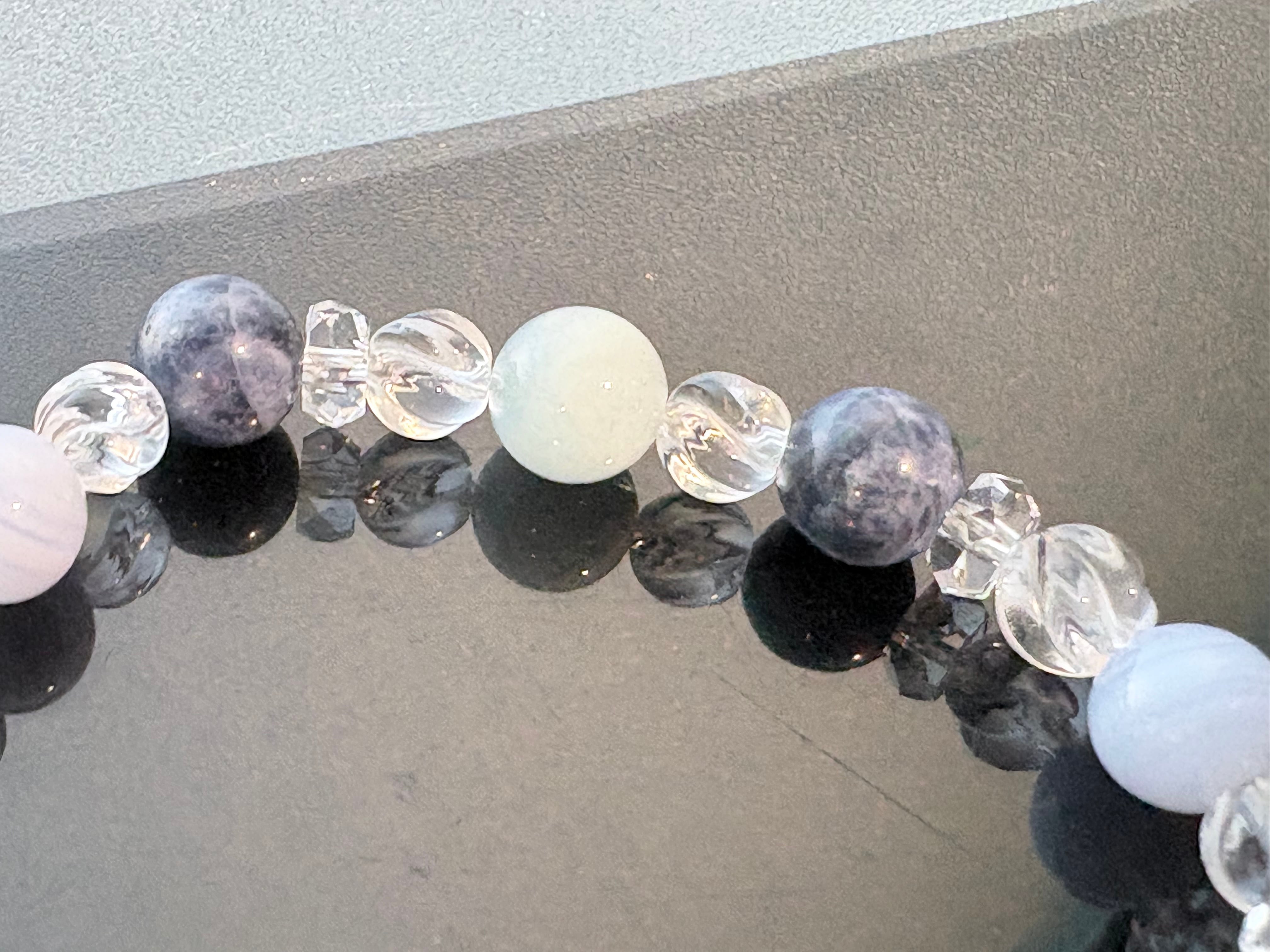 アクアマリン、ブルーレースアゲート、ソーダライトに、形状の異なる2種類の水晶(ツイスト・ボタン)を組み合わせた構成は、コミュニケーションの円滑化、心の平穏・理性の確立に特化した、非常に爽やかで知的なエネルギーを持ちます。