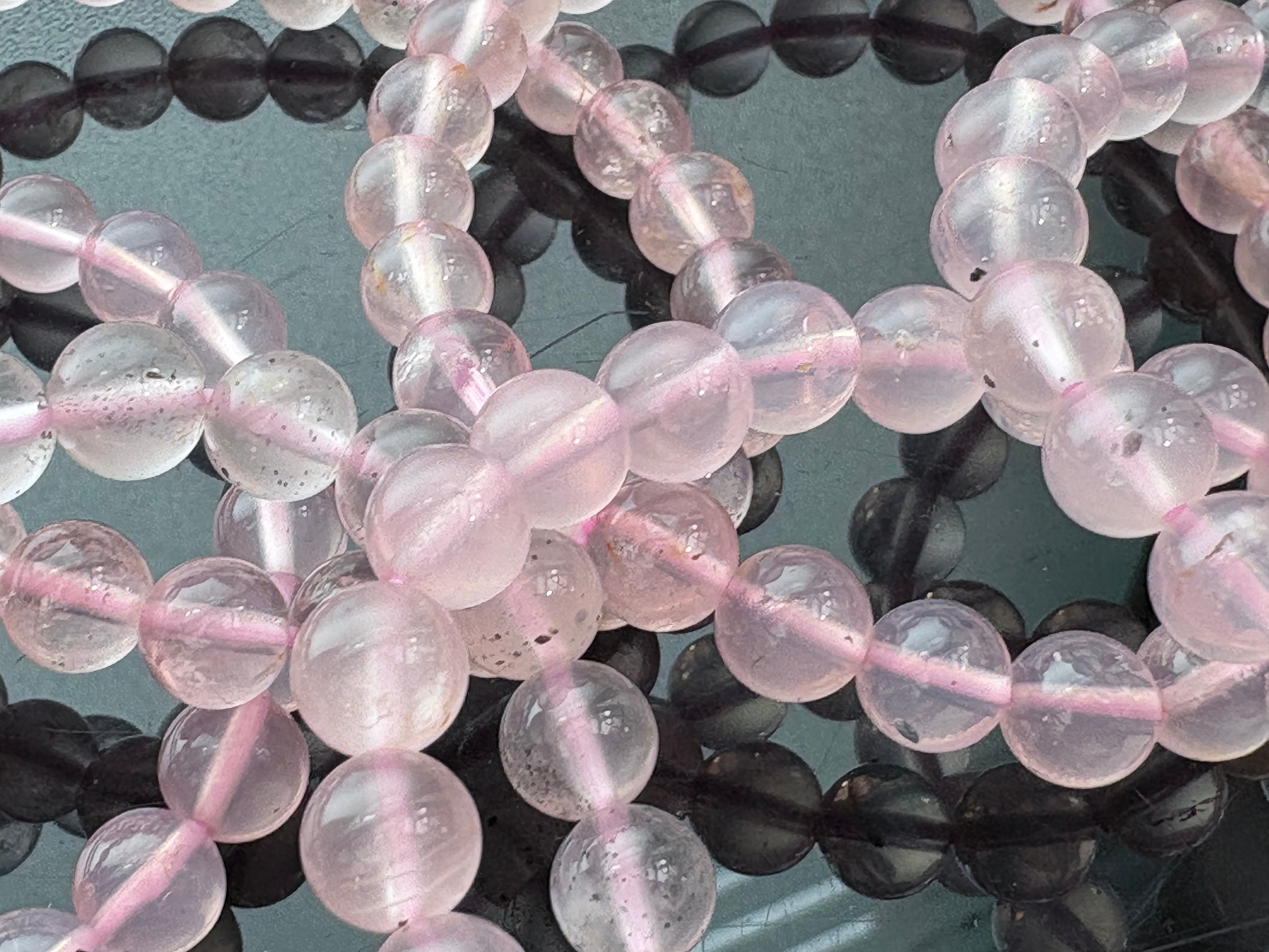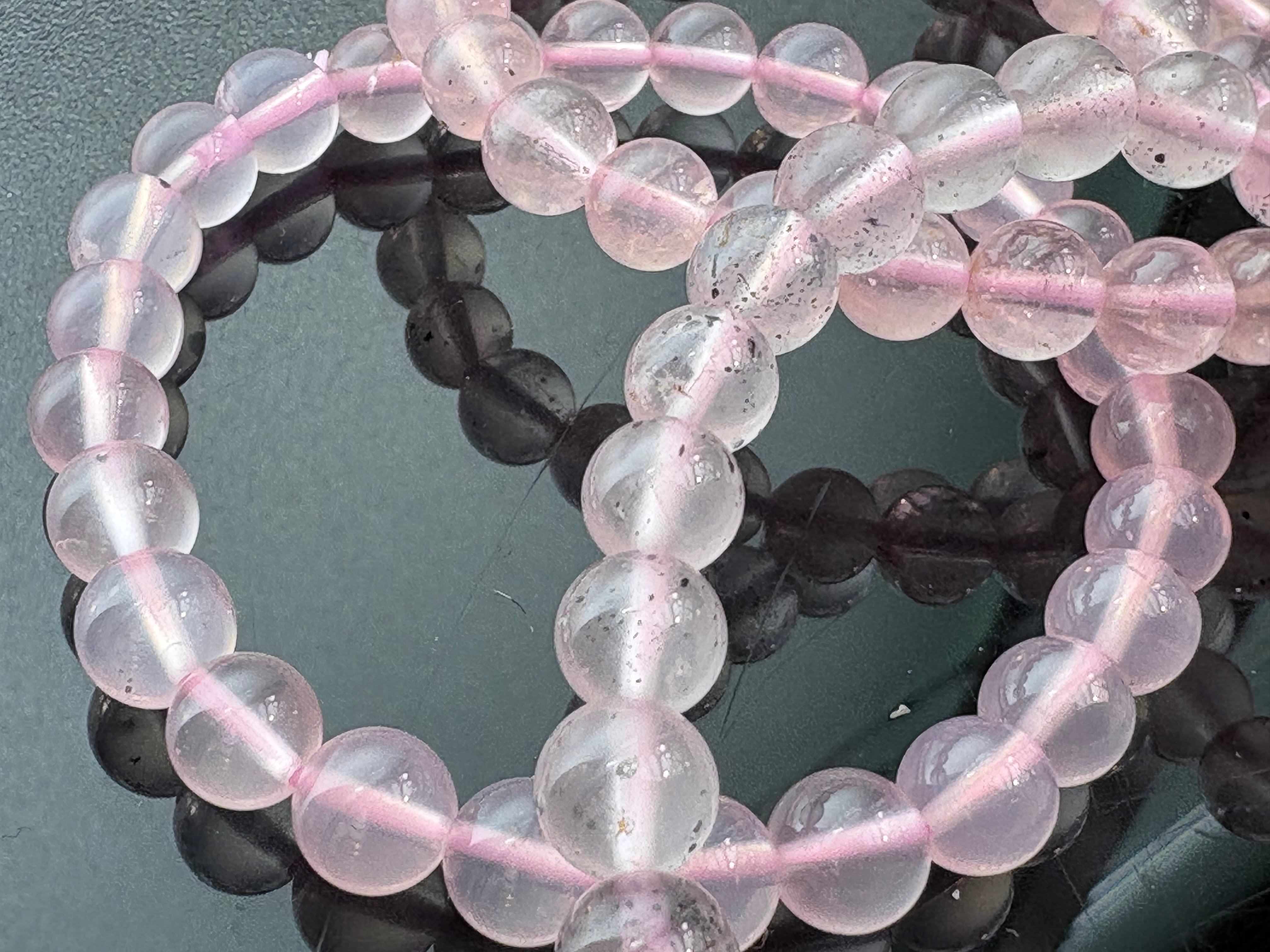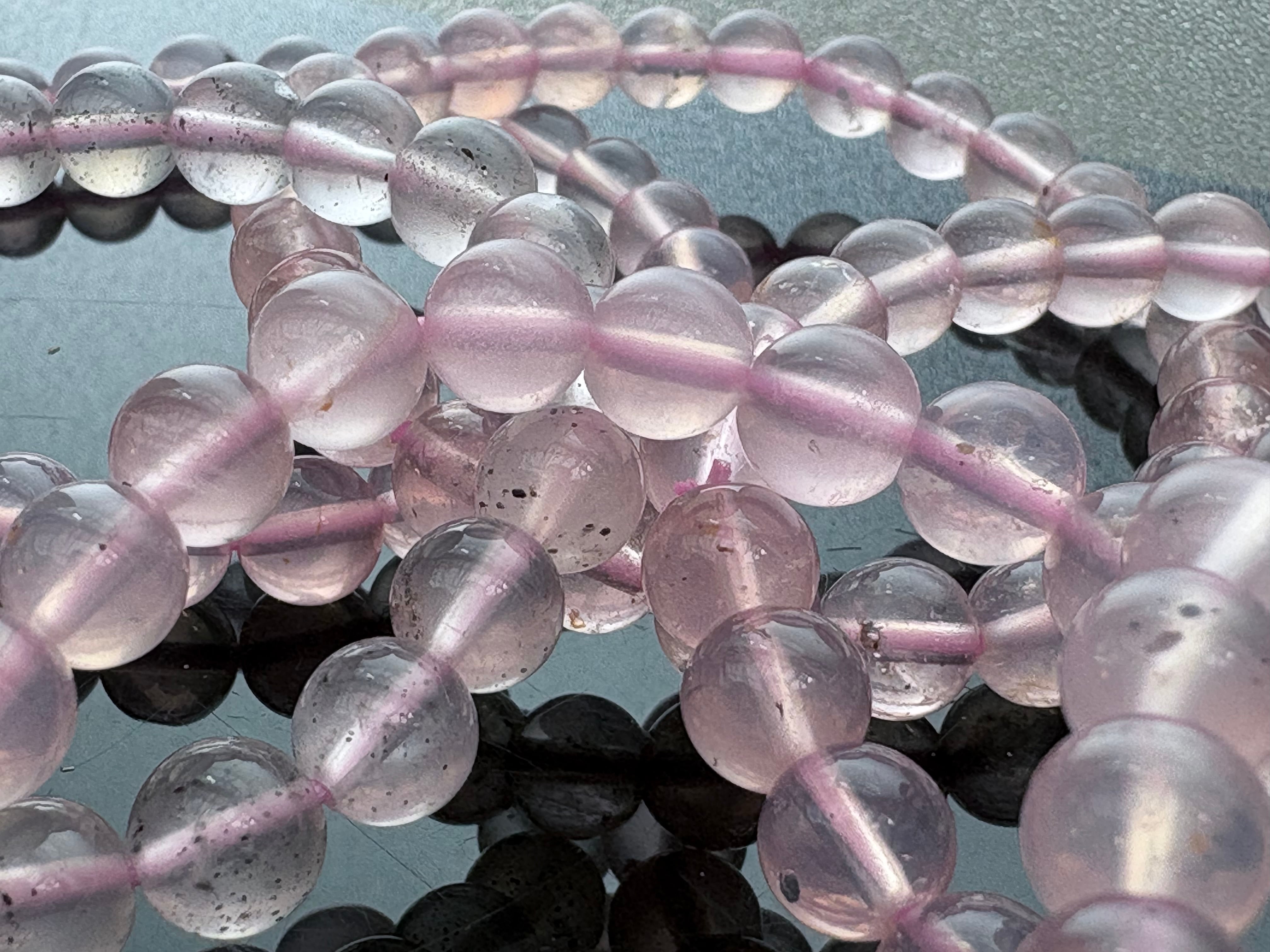 石の内部に微細なルチル(針状結晶)を含むことがあり、光の当たり方でスターが現れたり(スターローズクォーツ)、幻想的なシラーが見えたりすることがあります。
